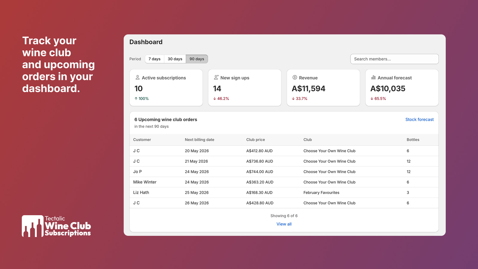 This gives you an at-a-glance overview of your wine club performance and quick access to common tasks.